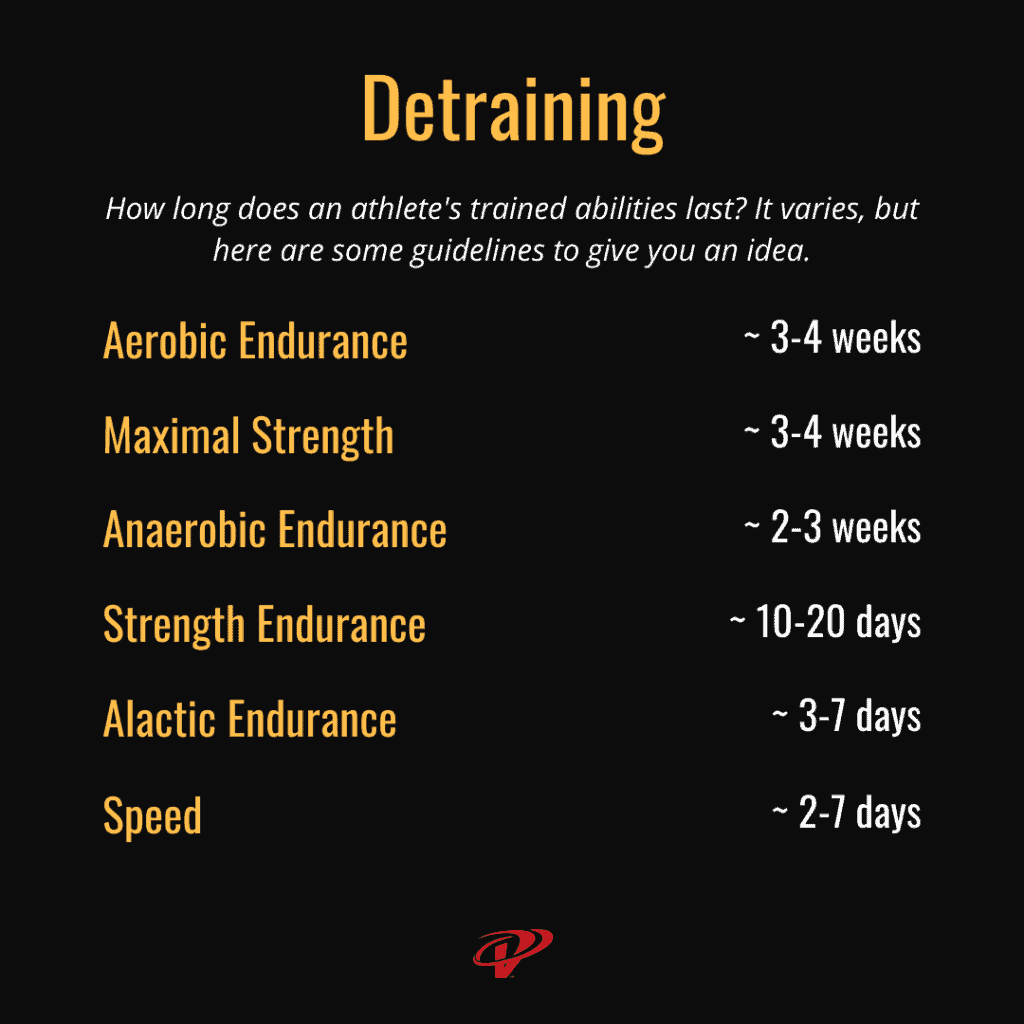 Although an athlete might not be able to train their stamina exactly as they would need it in their sport, they can stay close. That’s good because stamina starts dropping off between 3 and 30 days, depending on the energy system.