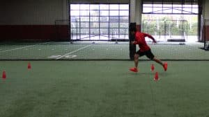 Place three cones (or something similar) in a line with five yards between each cone. The athlete starts in the middle in a square stance, facing directly ahead, with one hand on the ground. The athlete sprints five yards one direction, then ten yards back the other way, then turns around to sprint back through the middle.